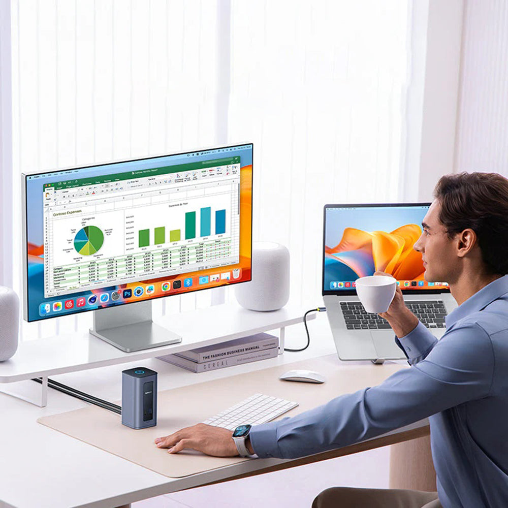 One connection, multiple possibilities. Baseus 12in1 extends the functions of your laptop and supports an organized and efficient workflow. Order the Baseus docking station! Dual 4K Display The docking station allows the connection of two 4K@60Hz monitors through a single USB-C connection, providing an extended workspace and increased productivity. Laptop Charging With up to 100W Power Delivery support, the dock ensures your laptop is powered through USB-C during daily use, without performance loss. Specifications: Material: aluminum alloy; Connection port: USB-C; Ports: 2x HDMI, 2x DisplayPort, 2x USB-C 3.2, 2x USB-A 3.2, 1x USB-A 2.0, 1x USB-C PD, 1x RJ45, 1x Audio Jack 3.5mm; HDMI/DisplayPort resolution: 4K@60Hz; USB-C 3.2 transfer speed: up to 10Gbps; USB-A 3.2 transfer speed: up to 10Gbps; USB-A 2.0 transfer speed: up to 480Mbps; USB-C PD charging power: 100W; RJ45 network speed: 1000Mbps; Audio Jack 3.5mm: 96kHz / 24bit; Dimensions: 126.69 x 65.5mm; Weight: approx. 497g.