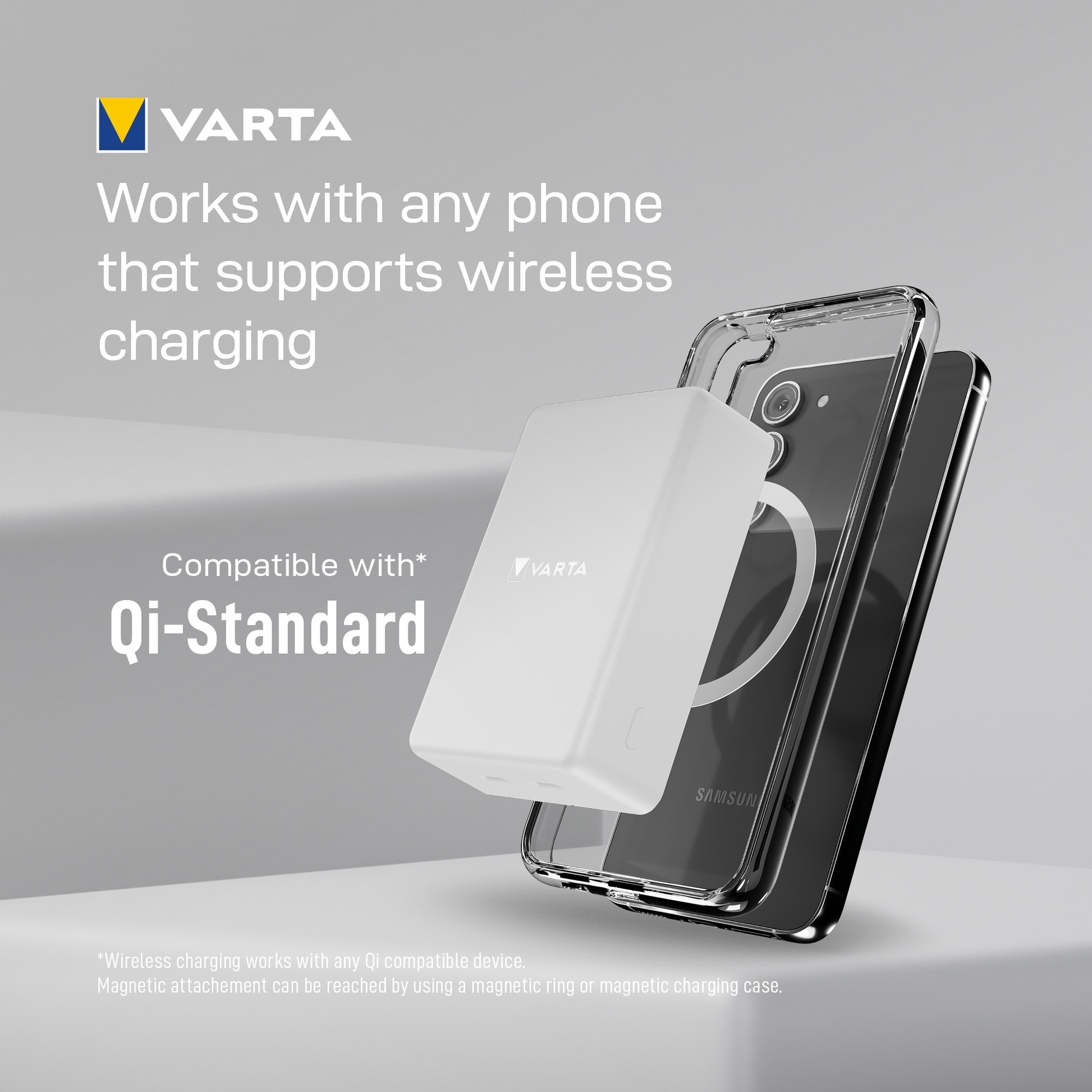 Magnetic technology allows for quick and secure attachment, ensuring perfect alignment between device and battery. The soft touch textured surface provides high comfort, and the illuminated VARTA logo indicates the remaining charge level. Ideal for simultaneous charging,